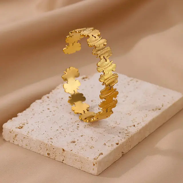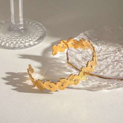 Make a statement with the Golden Bloom cuff—crafted from luxurious gold-colored stainless steel and adorned with an intricate flower design. This wide, chunky bangle blends vintage flair with modern elegance, perfect for weddings, events, or standout everyday wear.